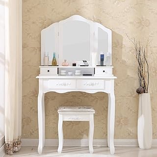 Boju 姫系 ドレッサー 鏡台 三面鏡 ホワイト おしゃれ 椅子付 収納庫付 引き出し ジュエリ 小物入れ 姿見 ミラ 猫足 木製 白 組立品
