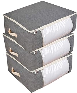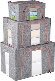 Tozpaicw ストレージバッグ オーガナイザーコンテナ - スチールフレーム 折りたたみ式 スタッカブル コットンリネン オックスフォードビン セット クリアウィンドウ & 強化キャリーハンドル付き 防水 大容量 衣類 クローゼット 寝具 ブランケット 3個パック (24L+66L+100L)、グレー