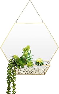 JuxYes 六角形メタルフレームウォールミラー 棚付き - 金色の壁掛けミラー チェーン付き モダンな幾何学模様 壁化粧品 収納ホルダー 小さなミラー 壁の装飾用